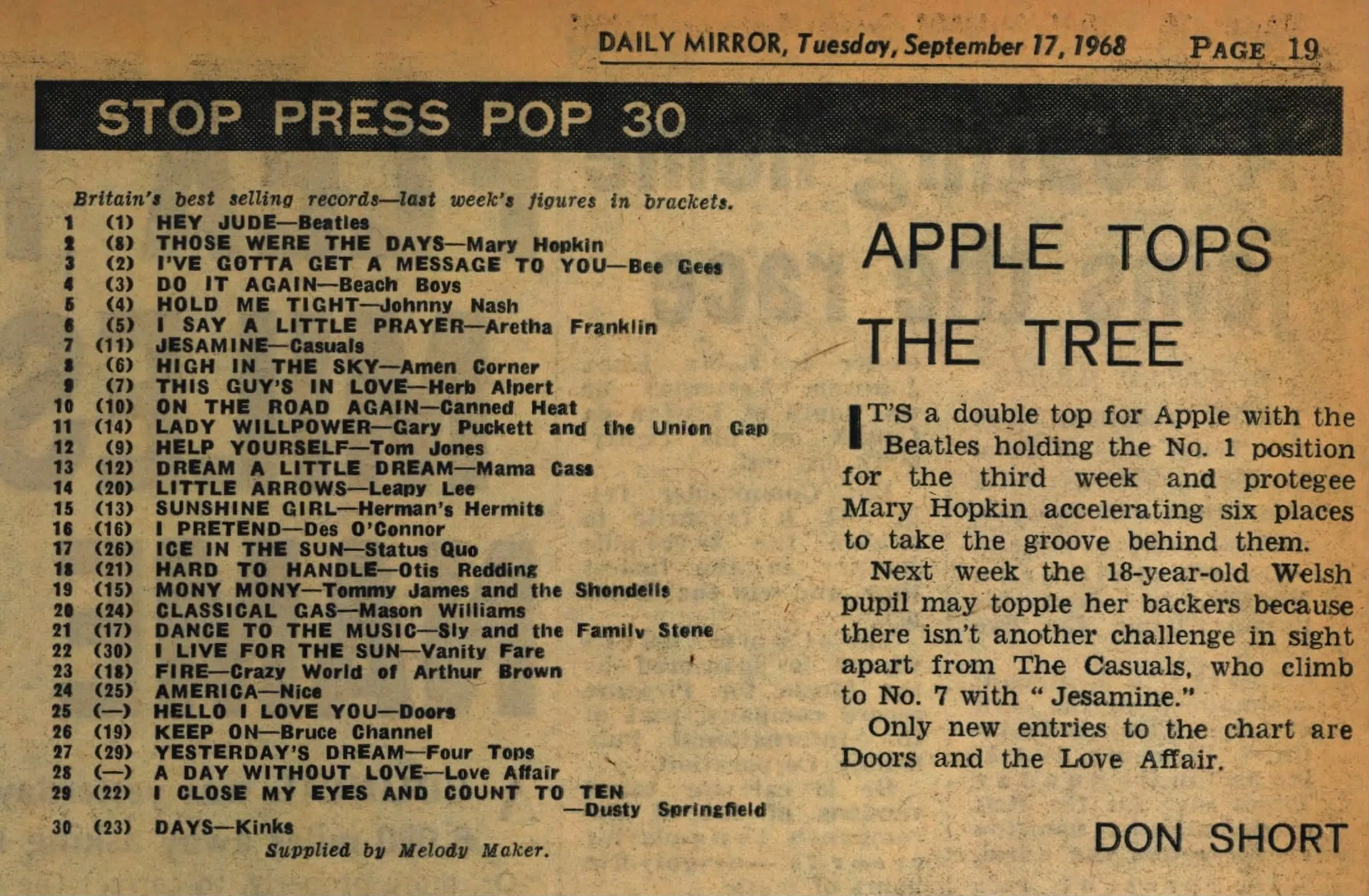 | “Those Were The Days / Turn, Turn, Turn” by Mary Hopkin | APPLE 2 | August 30, 1968 |