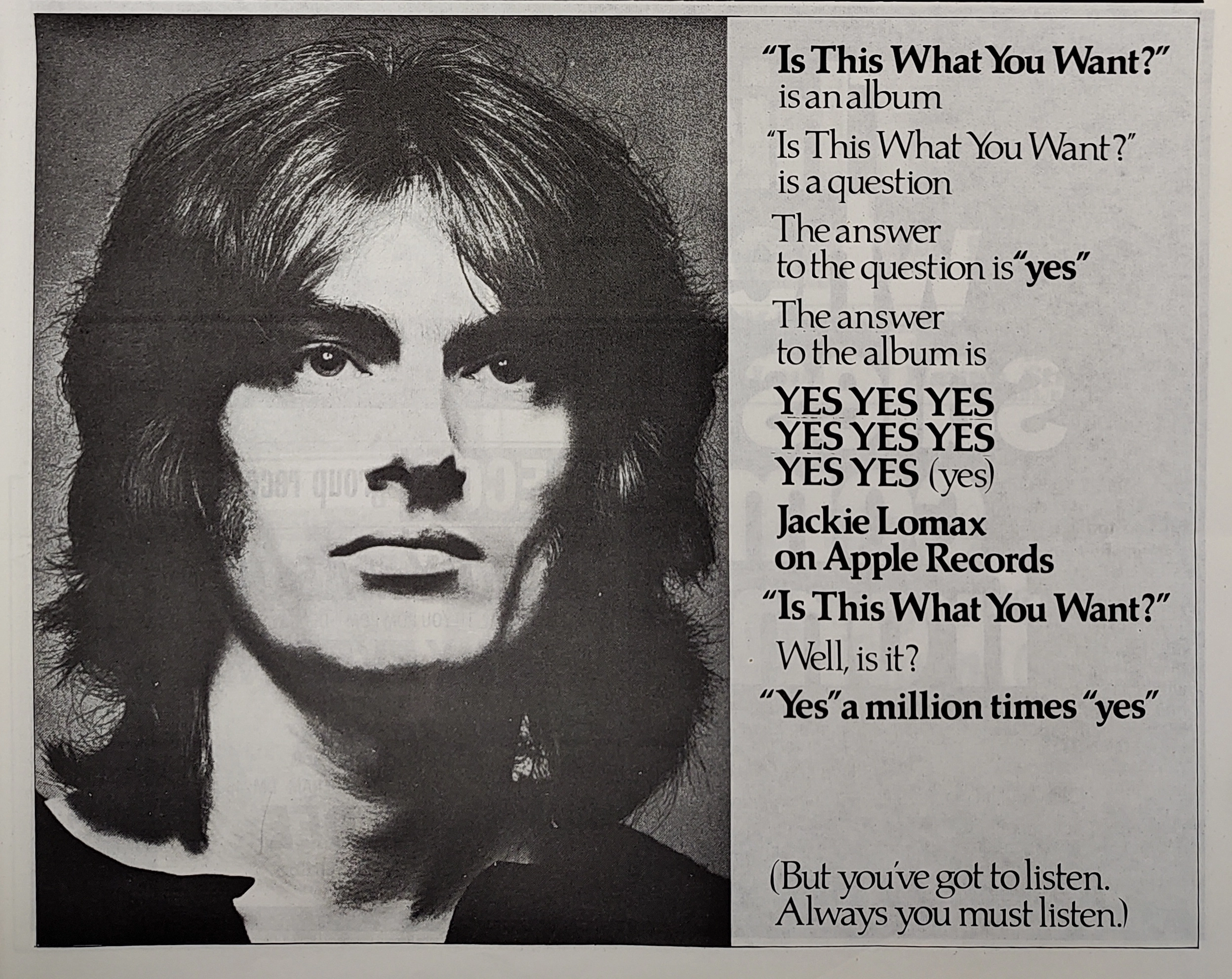 Is This What You Want? is the debut album by English rock and soul singer Jackie Lomax, released in 1969 on the Beatles’ Apple record label. It was produced by George Harrison and features contributions from Harrison’s Beatles bandmates Paul McCartney and Ringo Starr. The album includes Lomax’s debut single for Apple, the Harrison-written “Sour Milk Sea“. The US version added “New Day”, which was produced by Lomax and released as a non-album single in Britain.