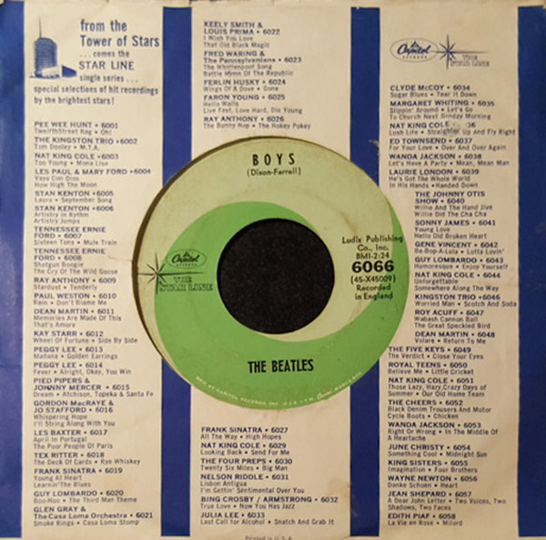 The single ‘Boys’/‘Kansas City’/‘Hey, Hey, Hey, Hey’ was released in the US as Capitol Starline 6066. This was the only one of these six ‘reissue’ singles to reach the US chart, albeit no higher than No. 102.