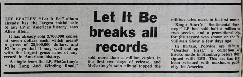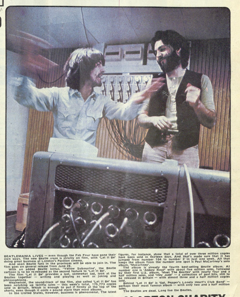Meanwhile, the sound-track of the film, also called ‘Let It Be’ has been notching up terrific sales — this week’s total, 175,773 copies sold in Britain. Which is enough to put if firmly at the top of the charts, even though it costs a pound more than most albums.