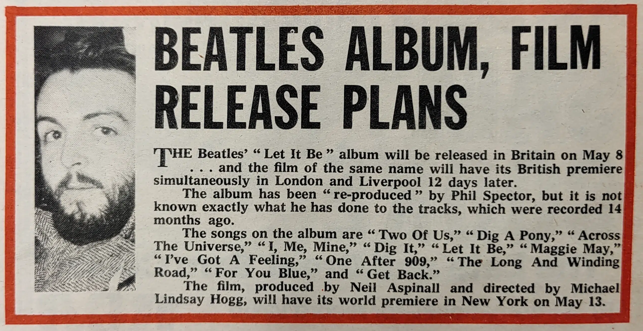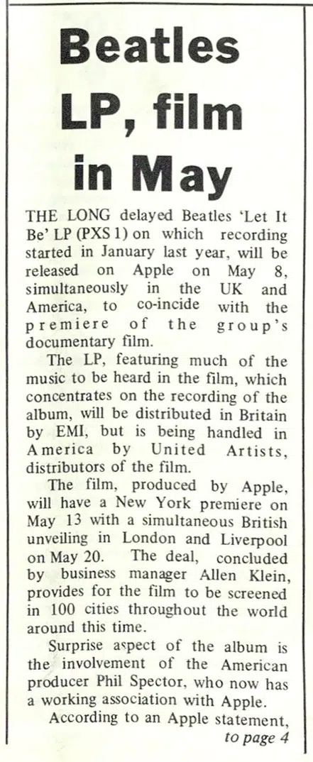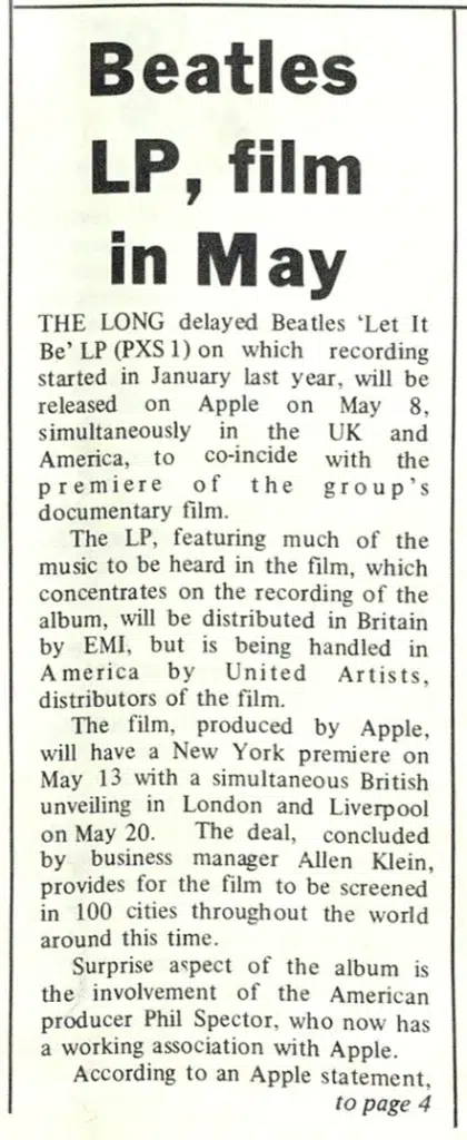 THE LONG delayed Beatles ‘Let It Be’ LP (PXS 1) on which recording started in January last year, will be released on Apple on May 8, simultaneously in the UK and America, to co-incide with the premiere of the group’s documentary film.