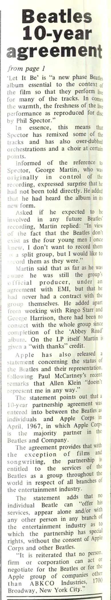 A statement was issued by business manager Allen Klein this week in which, on behalf of Apple Corps Ltd, it is pointed out that “… any individual Beatle cannot offer his services, appear alone, or with any other person in any branch of the entertainment industry — without the consent of Apple and the other Beatles.”