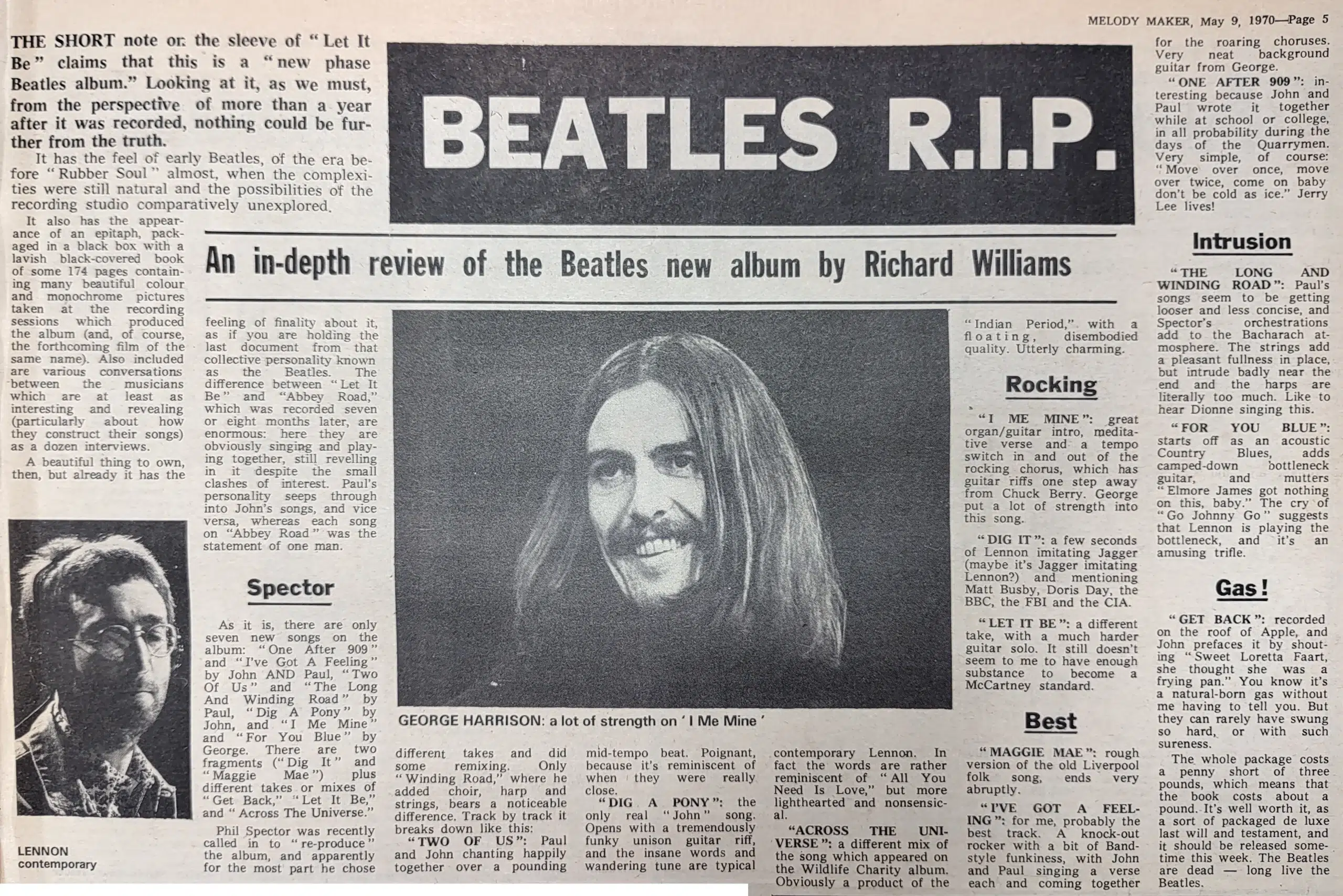 Following track is George’s Russian-flavoured “I Me Mine,” a strong ballad with a frantic centre; then it’s Lennon’s “Can You Dig It,” which is no more than a few seconds’ of a smile-raising chant about a number of items from the FBI to Matt Busby; then McCartney with a version of “Let It Be” — and then another few seconds of the old Liverpool ballad of “Maggie May.”