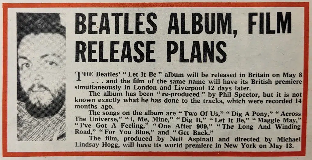 The Beatles’ long-awaited full-length feature film, the semi-documentary “Let It Be,” will have a double British premiere at London Pavilion and Liverpool Odeon on Wednesday, May 20. And invitations will be going out to all members of the Beatles to attend the star-studded screenings. In a week when Paul McCartney was reported as saying that “none of us wants to admit that the party is over,” Apple announced that the colour movie — described as a “bioscopic experience” — would have its world premiere in New York on May 13 and would be released in May in 100 major cities throughout the world, including saturation exposure across the United States.