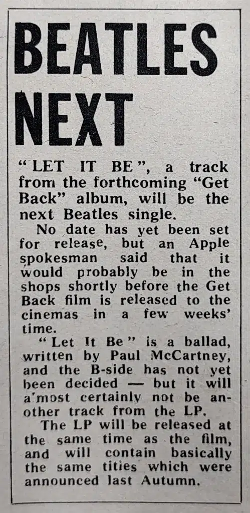 BEATLES’ new single, “Let It Be” — out on February 27 — should make as big an impact as “Hey Jude,” writes Ray Coleman, who heard an advance pressing this week. It is hymnal in style and the sort of sound the Beatles have been producing for Billy Preston: loaded with gospel feeling and the voice of Paul McCartney at its most soulful, as on “Hey Jude.” After hearing it once or twice you can’t stop humming it. The song, a beauty, was written by Paul.