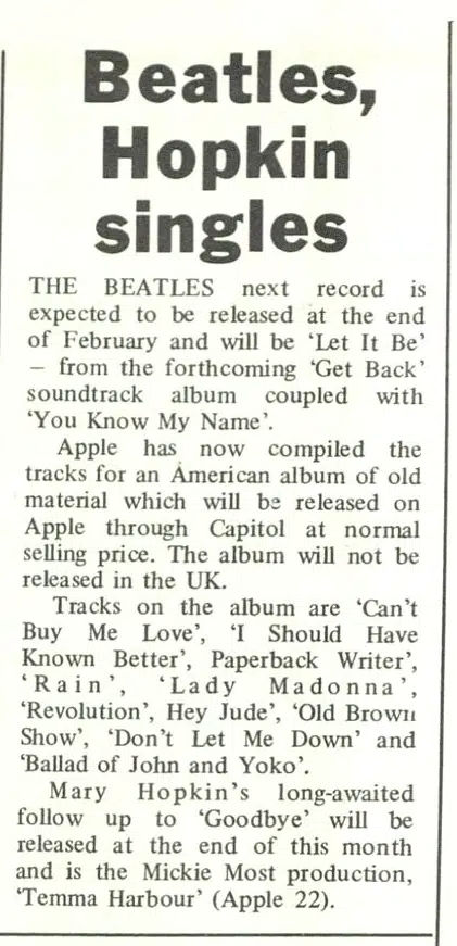 THE BEATLES next record is expected to be released at the end of February and will be ‘Let It Be’ – from the forthcoming ‘Get Back’ soundtrack album coupled with ‘You Know My Name’.