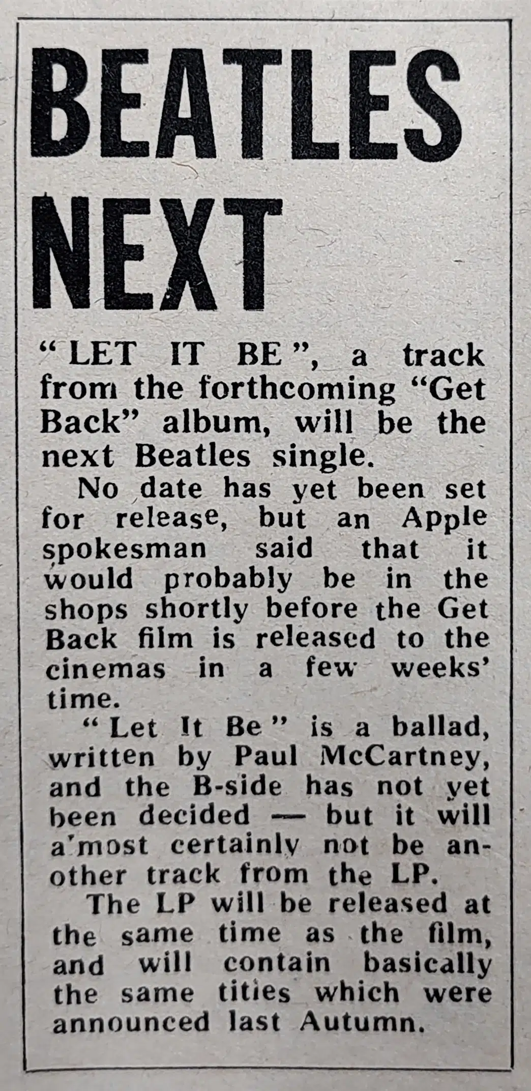 “Let It Be” is a ballad, written by Paul McCartney, and the B-side has not yet been decided — but it will almost certainly not be another track from the LP.
