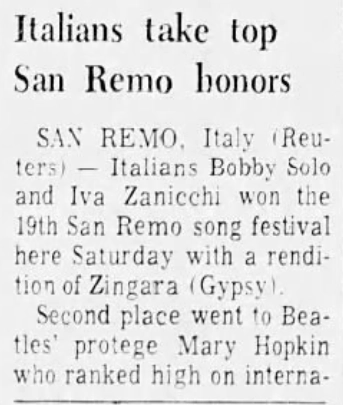 Second place went to Beatles’ protégé Mary Hopkin, who ranked high on international hit parades with Those Were the Days. She sang a nostalgic ballad Lontano Dagli Occhi (Far From Sight) together with last year’s festival winner Sergio Endrigo.
