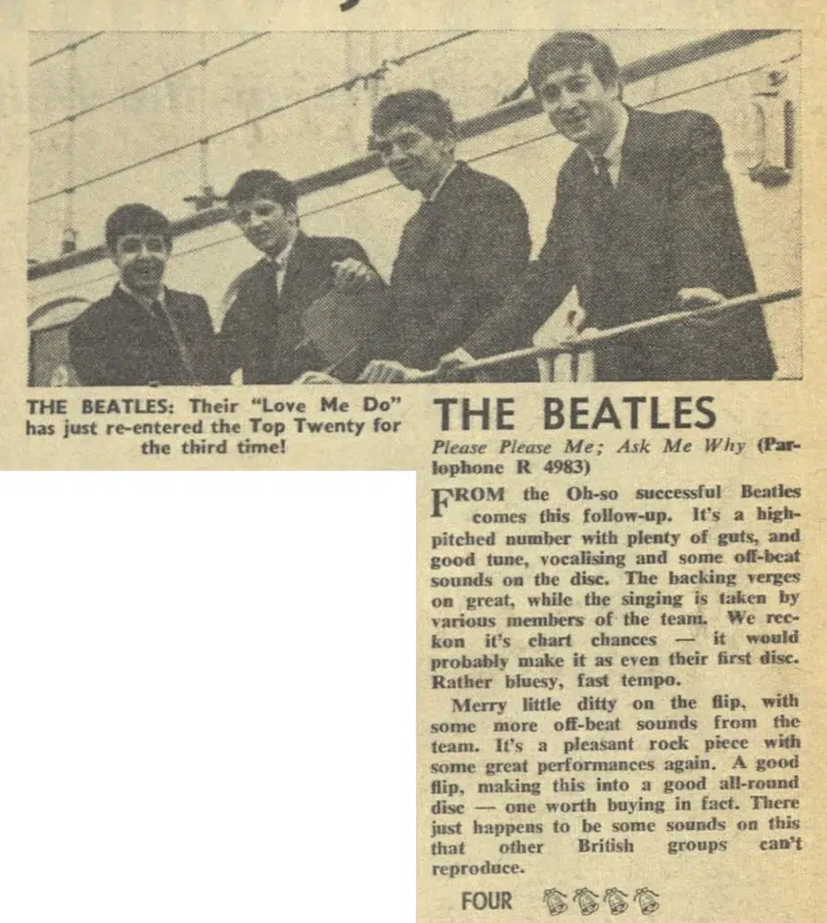 Capitol Records, EMI’s United States label, was offered the right to release “Please Please Me” in the US, but turned it down. Instead, it was placed with Transglobal, an EMI affiliate that worked to place foreign masters with US record labels. It was told to find an American outlet for the record as quickly as possible, in order to appease Martin and Beatles manager Brian Epstein. “Please Please Me” was then offered to Atlantic, which also rejected it. Finally, Vee-Jay, which had released the top-five hit “I Remember You” by Frank Ifield in 1962 (another record that Capitol had turned down), was offered the right to issue “Please Please Me” in the States, and chose to do so. The exact date of the US issue was lost for decades, but research published in 2004 showed that the single, “Please Please Me“/”Ask Me Why“, was released by Vee-Jay on 7 February 1963, coincidentally exactly one year before the Beatles’ plane landed in New York on their first visit as a band to America.