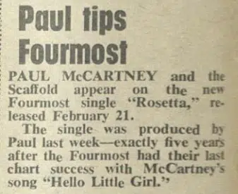 […] Paul McCartney has produced the latest single by the Fourmost. […] The Fourmost revive the old jazz classic “Rosetta” for their next CBS single. It comes out on February 21, and was produced by Beatle Paul McCartney.