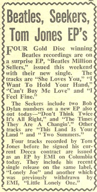 The Beatles’ Million Sellers was an EP by the Beatles, released 6 December 1965. The EP was only released in mono with the catalogue number Parlophone GEP 8946. It was also released in New Zealand. The EP consists of songs released by the Beatles, that sold over 1 million copies each, the highest being She Loves You, which sold 1.89 million copies.