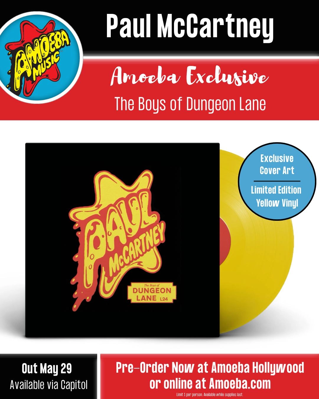 We are honored and thrilled to announce an Amoeba Exclusive limited edition pressing of the new Paul McCartney album! “The Boys of Dungeon Lane” will be available May 29th via Capitol Music Group with exclusive alternative cover art on yellow vinyl!