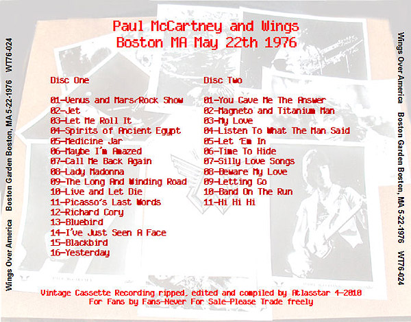 You may note I’ve labled this Source One. This is a different source recording then the one posted recently by shopkin527 (https://www.hungercity.org/details.php?id=9479). I dubbed this as source one since to my estimation it was the first one freely traded. shopkin527’s version also appeared on a Japanese 2-CD set “Wings Over Boston”. No disrespect to shopkin527 but the cd set has been eq’ed and sounds a bit better because of it, However the eq has also brought up the audience noise a bit in the process, so opinions will vary. The quality of this upload is not as nice as either of those so you don’t need htis post unless you are a completist. Please note this too is missing Soily as it appears to not have been performed.