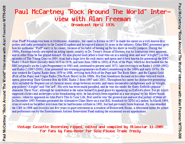 This is a two part radio broadcast of an interview with Alan Freeman which was original broadcast in April 1976. The actual date varied by station. I had several copies of this broadcast but they all seem to originate from the same source. Not a very good recording to begin with, it seemed to be made by placing a mike in front of a speaker rather then a direct recording. It also suffered from being off pitch and off speed and the levels varied throughout the tape, more so in part one then part two. The interview bit is intermingled with music. Part two had a lot of music as filler much of which I edited out. That is the reason part two is considerably shorter. Fortunatly this allows it all to fit on one cd if one is so inclined. I did some clean-up work on this and adjusted the speed and pitch, which improved things considerably although I am sure there is a better copy of this some where in existance.