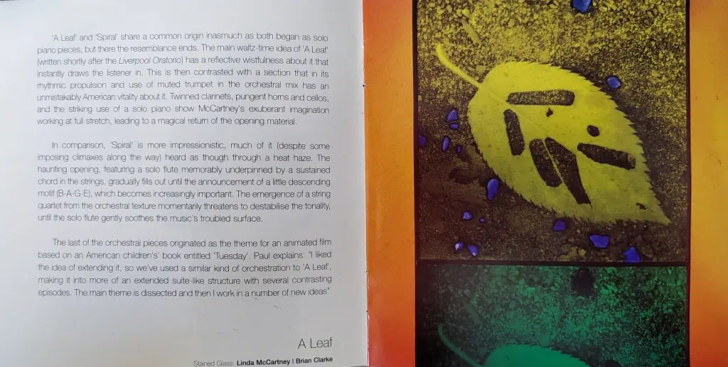 A Leaf and Spiral share a common origin inasmuch as both began as solo piano pieces, but there the resemblance ends. The main waltz-time idea of A Leaf (written shortly after the Liverpool Oratorio) has a reflective wistfulness about it that instantly draws the listener in. This is then contrasted with a section that in it’s rhythmic propulsion and use of muted trumpet in the orchestral mix has an unmistakably American vitality about it. Twinned clarinets, pungent horns and cellos, and the striking use of a solo piano show McCartney’s exuberant imagination working at full stretch, leading to a magical return of the opening material.