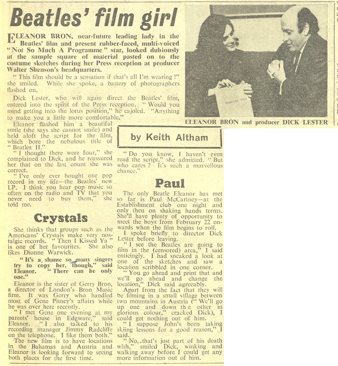 In 1965, Eleanor Bron appeared in the Beatles’ film Help! ; her name inspired Paul McCartney when he composed “Eleanor Rigby“.