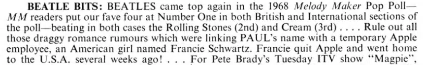 Rule out all those draggy romance rumours which were linking Paul’s name with a temporary Apple employee, an American girl named Francie Schwartz. Francie quit Apple and went home to the USA several weeks ago!