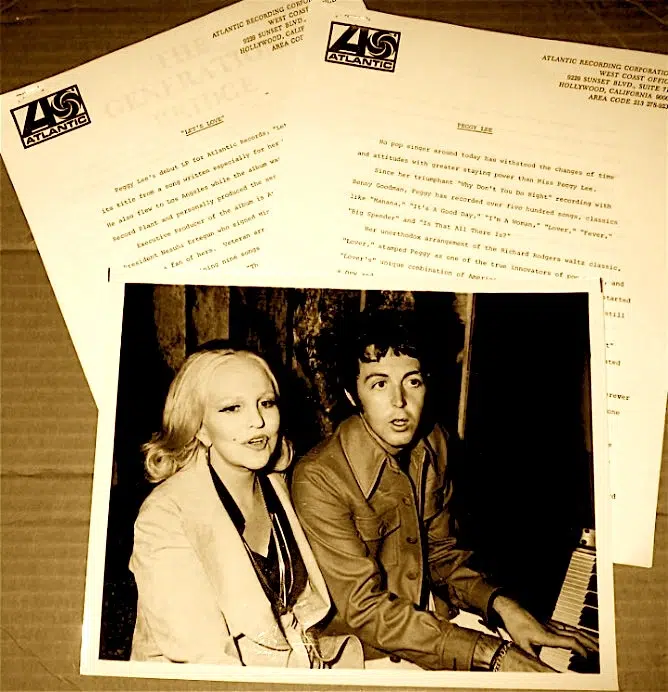While Peggy Lee was in London for a 1970 engagement at the Royal Albert Hall, she invited Paul and Linda McCartney to dinner at The Dorchester Hotel. At the dinner, the couple gifted Lee with a song they had written entitled, “Let’s Love”. In July 1974, with Paul McCartney producing, Lee recorded the song at the Record Plant in Los Angeles, and it became the title track for her 40th album, her only one on Atlantic Records.
