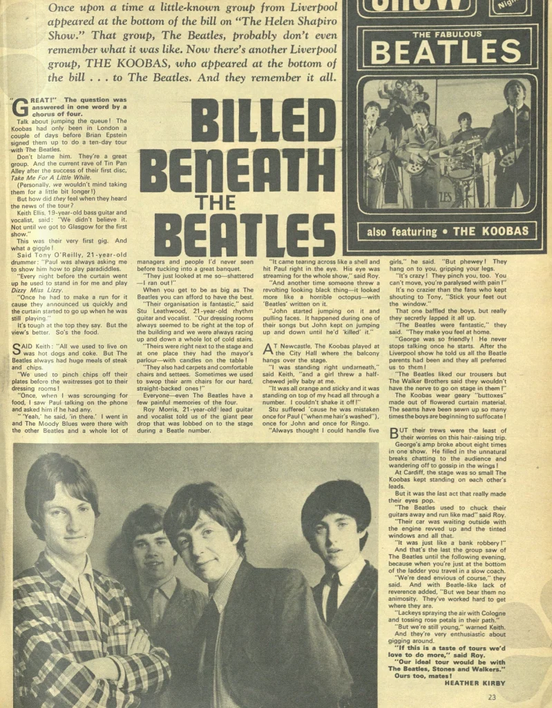 The Koobas were among the support acts for The Beatles’ 1965 UK Tour, sharing the bill with the Moody Blues, Beryl Marsden, Steve Aldo, the Marionettes, and the Paramounts.