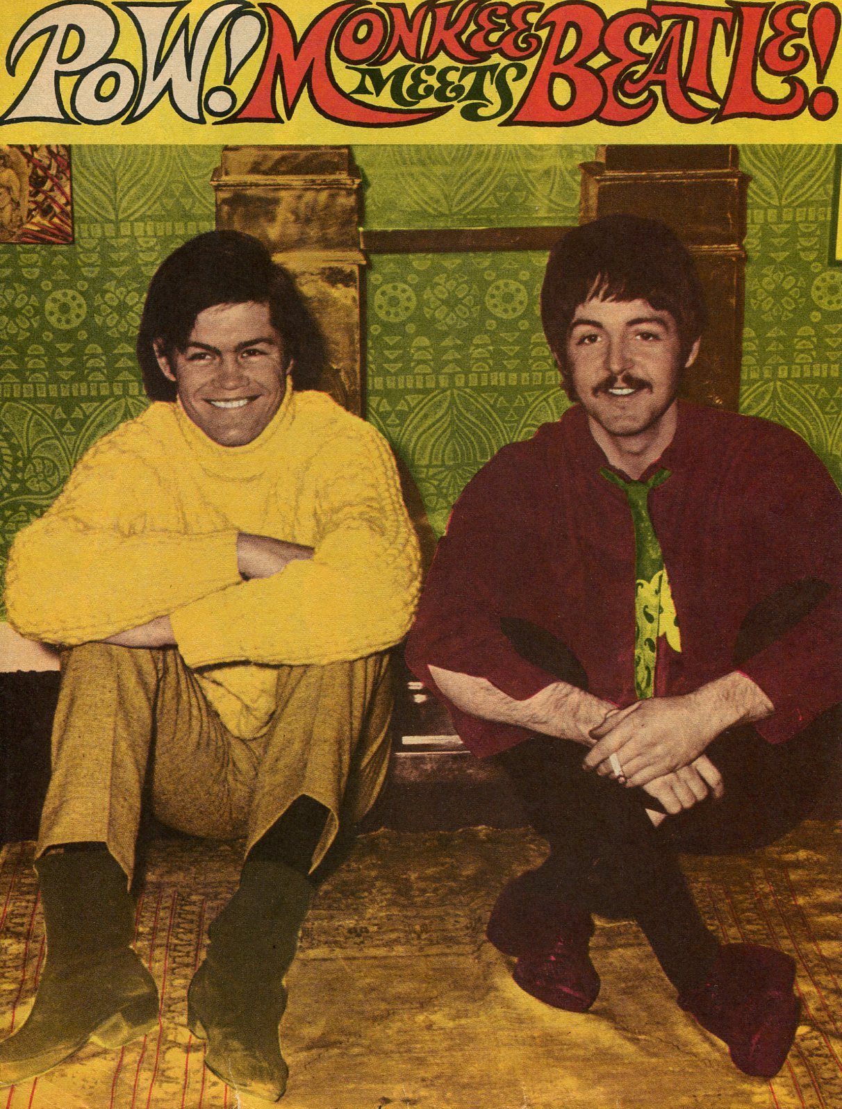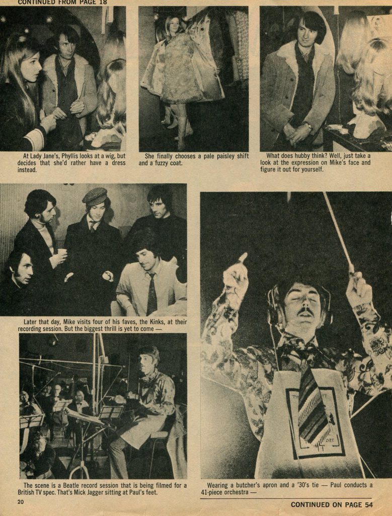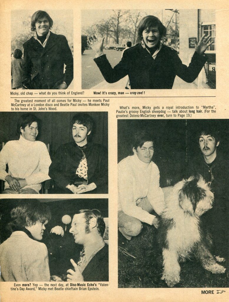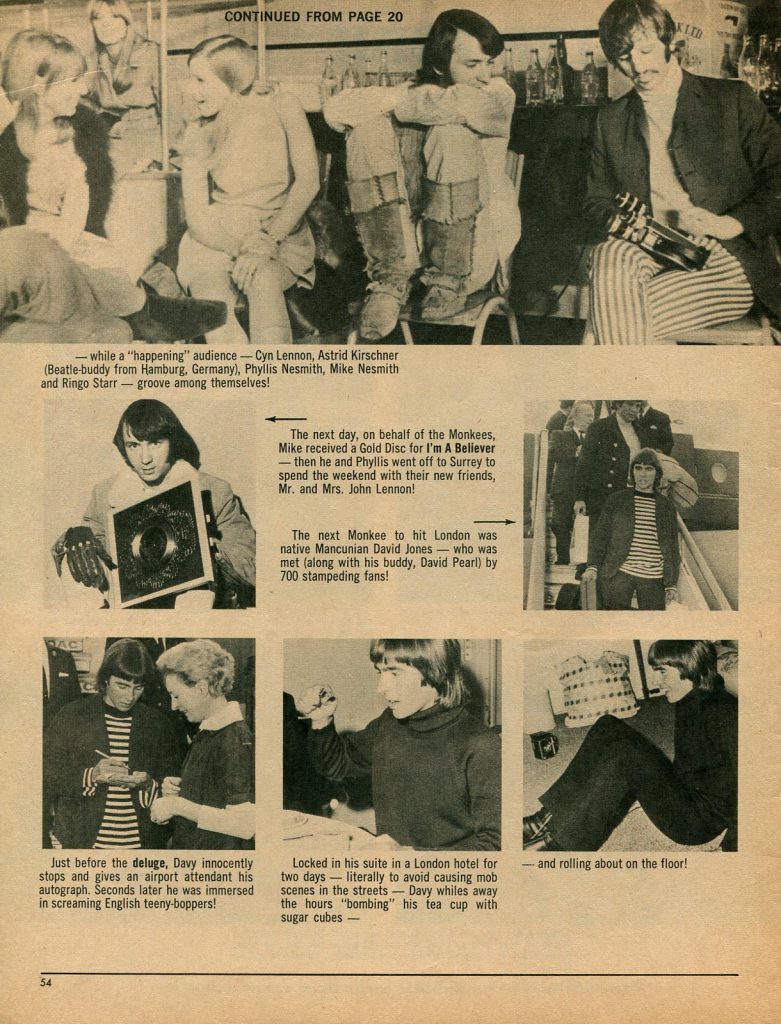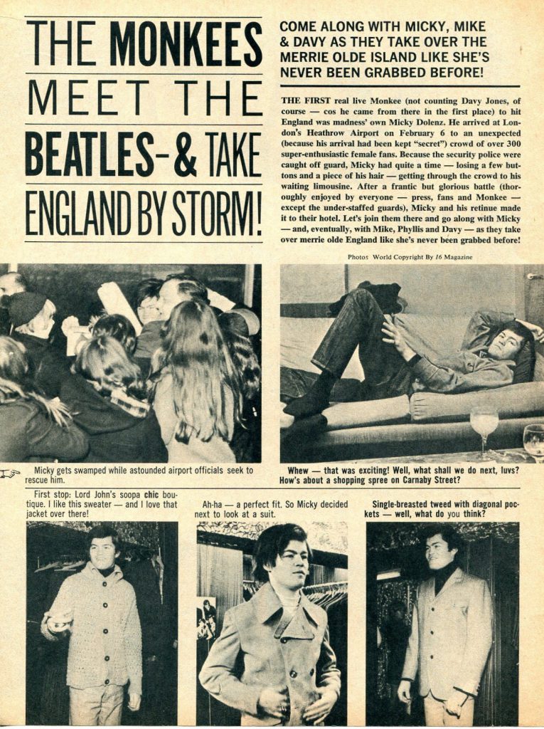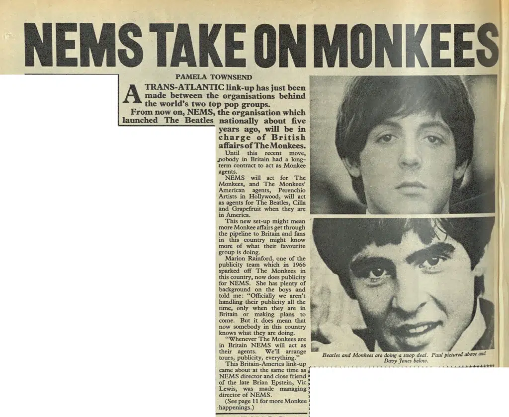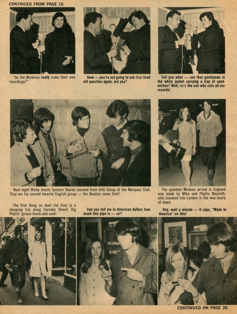 […] The Monkees’ UK tour in 1967 received a chilly reception; the front pages of several UK and international music papers proclaimed that the group members did not always play their own instruments or sing the backing vocals in the studio. They were derisively dubbed the “Pre-Fab Four” and the Sunday Mirror called them a “disgrace to the pop world.” However, George Harrison praised the Monkees’ self-produced musical attempts. Peter Tork was later one of the musicians on Harrison’s album Wonderwall Music, playing Paul McCartney’s five-string banjo. Nesmith attended the Beatles’ recording session for “A Day in the Life” at Abbey Road Studios. At that time, he reportedly asked John Lennon, “Do you think we’re a cheap imitation of the Beatles, your movies and your records?” Lennon replied, “I think you’re the greatest comic talent since the Marx Brothers. I’ve never missed one of your programs”. […