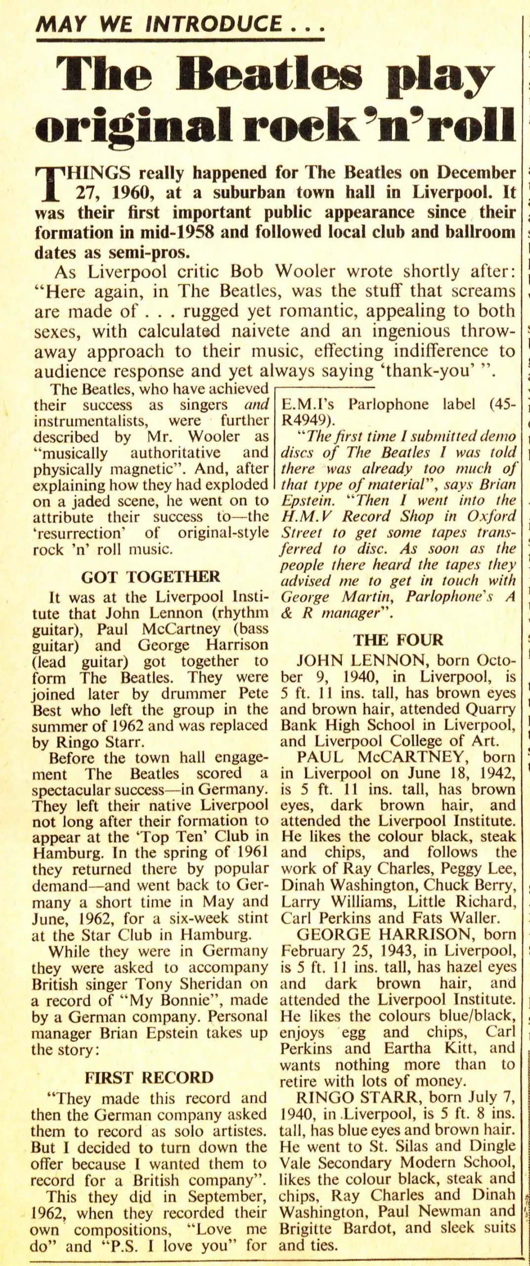 It’s funny, the memories that come into your head. I think that was when I was doing ‘Are You Lonesome Tonight?’ In the middle of the record, Elvis delivers this little soliloquy – “They say the world’s a stage…” So I tried this at Litherland. I glanced at the rest of the band and they were peeing themselves. That was the last time I did that number! I think we were advertised in the Liverpool Echo as “Direct from Hamburg!” – so the kids in the audience thought we were Germans. We had our hair forward, our leather jackets on, we looked different… They were quite surprised when we started talking Liverpool English.