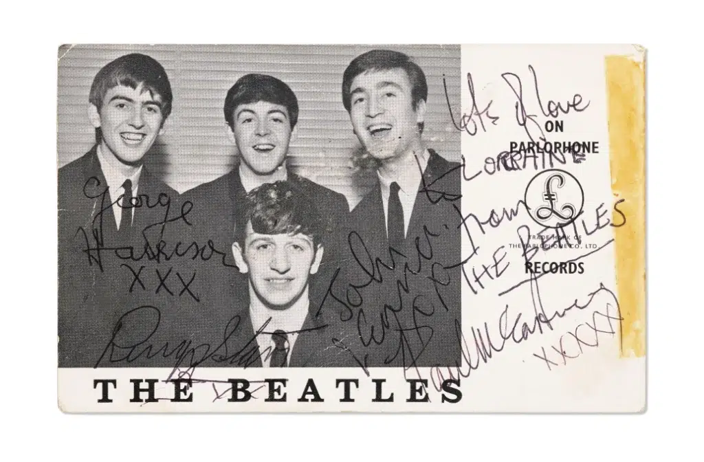 This set list, and that in the preceding lot, is one of only eight Beatles set lists written by a band member known to be in existence. Six further Beatles set lists are known to exist but they are in the hands of either Road Manager Neil Aspinall or Roadie Mal Evans. Only two other Beatles set lists are accompanied by autographs from the band: one with a complete set of autographs and another signed by Ringo Starr and John Lennon on the reverse. These autographs are signed to “Lorraine,” whose father drove the Beatles in Luton on the evening of April 17, 1963.