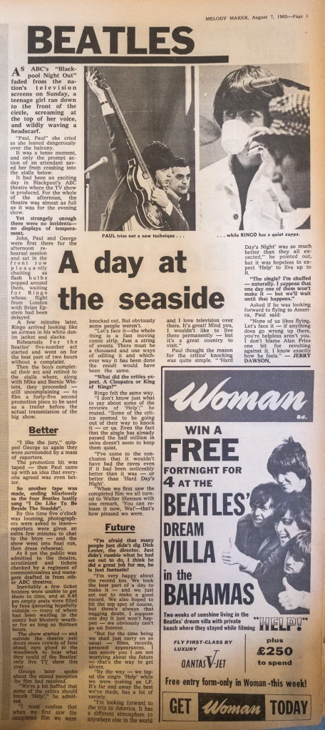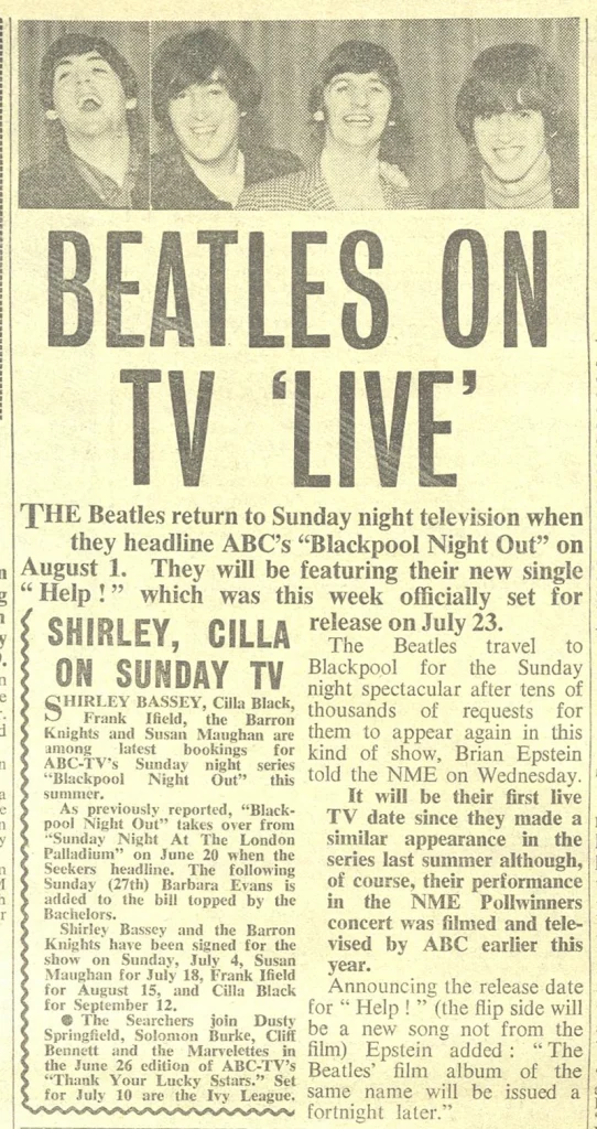 Four songs taken from the six performed by the Beatles on the British television show Blackpool Night Out, broadcast live to the nation on summer Sunday evenings from the northern seaside resort. It was the group’s second and last appearance on the programme. The sequence comprises I Feel Fine, the A-side of the single that had held the number one spot at Christmas 1964, Ticket To Ride, number one at Easter 1965, the first stage performance of Yesterday, already beginning to attract attention beyond its unheralded placement as the thirteenth track of the Beatles’ latest album, and the first stage performance of Help! – the title of that new album, the Beatles’ new film and new 45.