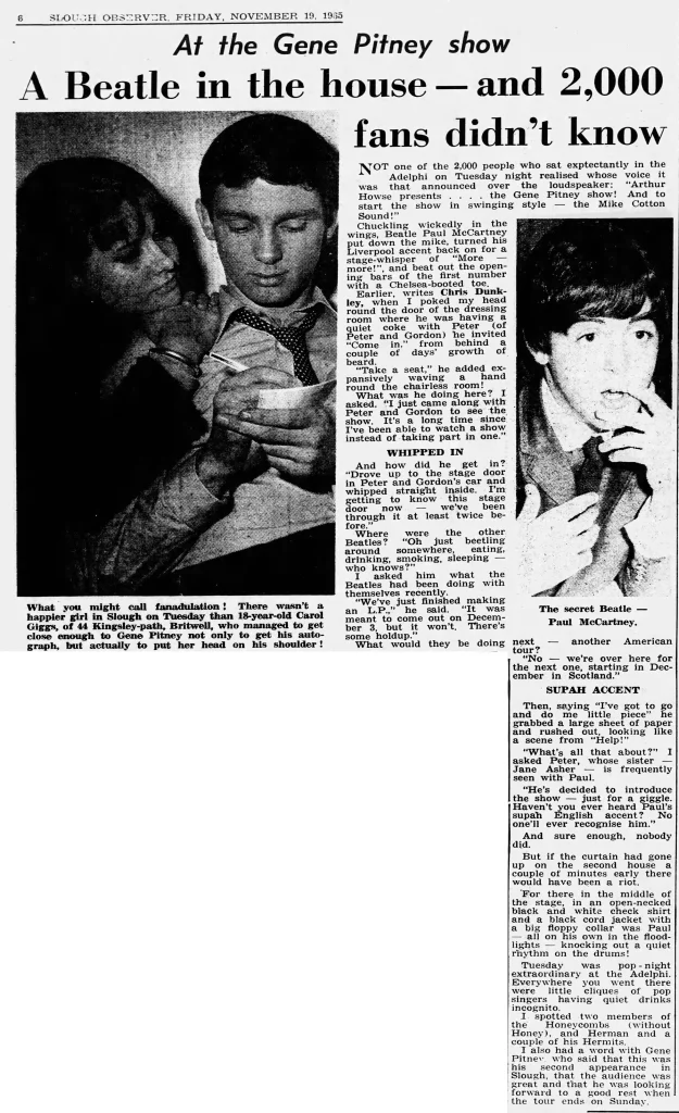 “What’s all that about?” I asked Peter, whose sister — Jane Asher — is frequently seen with Paul. “He’s decided to introduce the show — just for a giggle. Haven’t you ever heard Paul’s supah English accent? No one’ll ever recognise him.”