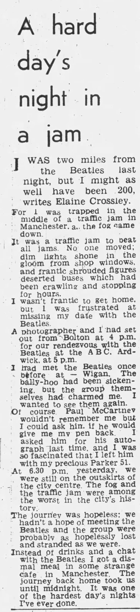 At 6.30 p.m. yesterday, we were still on the outskirts of the city centre. The fog and the traffic jam were among the worst in the city’s history. The journey was hopeless: we hadn’t a hope of meeting the Beatles and the group were probably as hopelessly lost and stranded as we were. Instead of drinks and a chat with the Beatles I got a dismal meal in some strange café in Manchester. The journey back home took us until midnight. It was one of the hardest day’s nights I’ve ever done.
