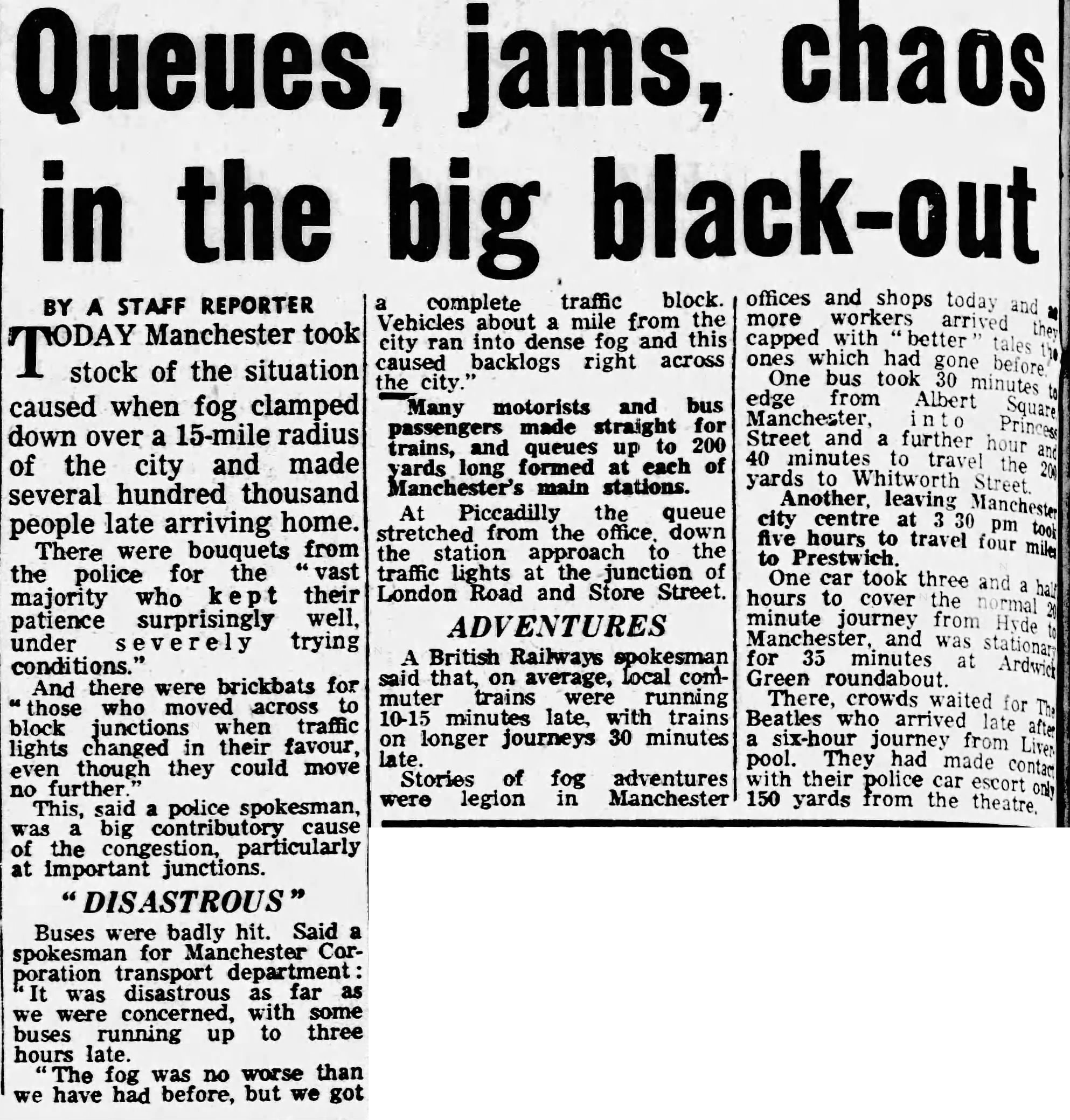 Today Manchester took stock of the situation caused when fog clamped down over a 15-mile radius of the city and made several hundred thousand people late arriving home. There were bouquets from the police for the “vast majority who kept their patience surprisingly well, under severely trying conditions.”