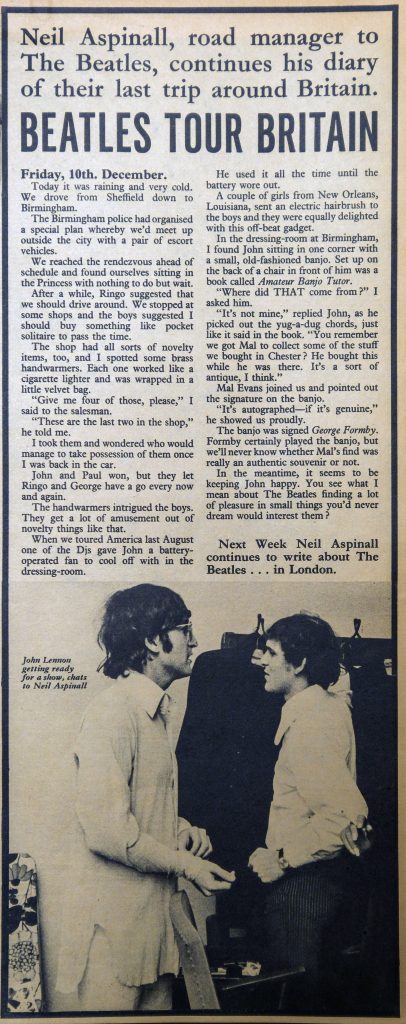The banjo was signed George Formby. Formby certainly played the banjo, but we’ll never know whether Mal’s find was really an authentic souvenir or not. In the meantime, it seems to be keeping John happy. You see what I meant about The Beatles finding a lot of pleasure in small things you’d never dream would interest them?