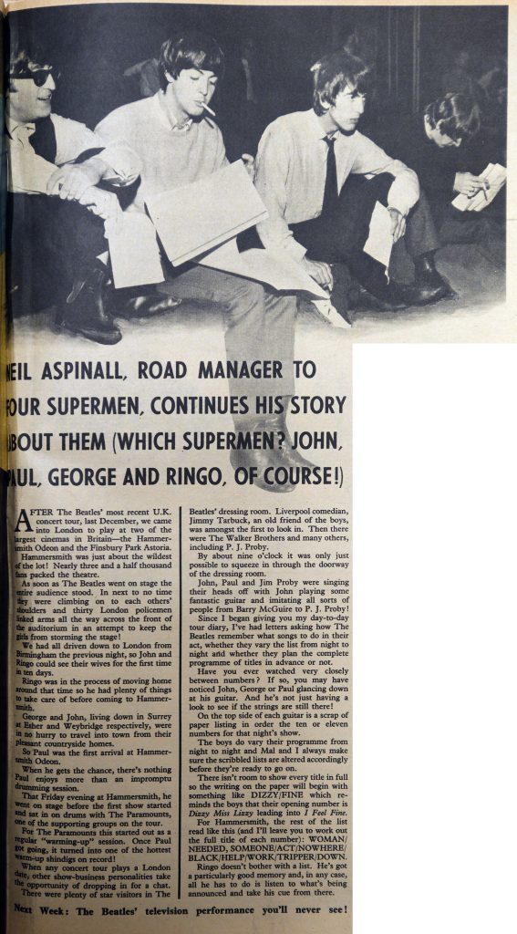 Since I began giving you my day-to-day tour diary, I’ve had letters asking how The Beatles remember what songs to do in their act, whether they vary the list from night to night and whether they plan the complete programme of titles in advance or not. Have you ever watched very closely between numbers? If so, you may have noticed John, George or Paul glancing down at his guitar. And he’s not just having a look to see if the strings are still there! On the top side of each guitar is a scrap of paper listing in order the ten or eleven numbers for that night’s show.