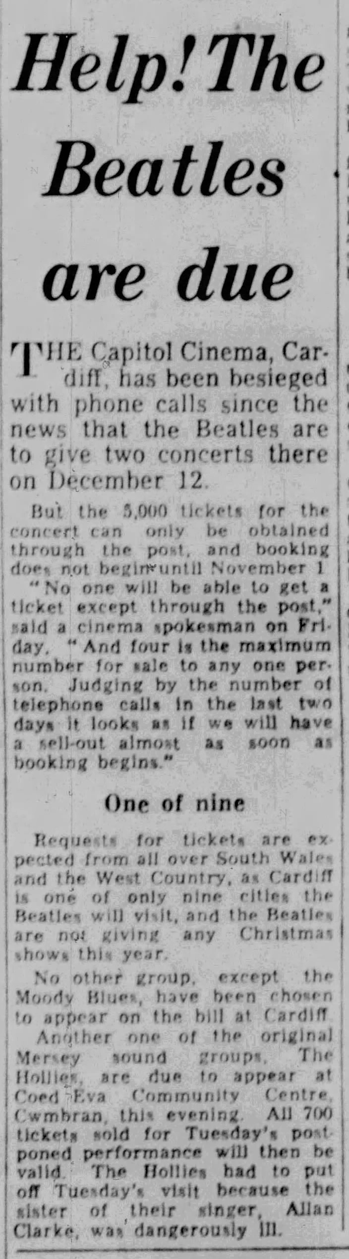 Requests for tickets are expected from all over South Wales and the West Country, as Cardiff is one of only nine cities the Beatles will visit, and the Beatles are not giving any Christmas shows this year.
