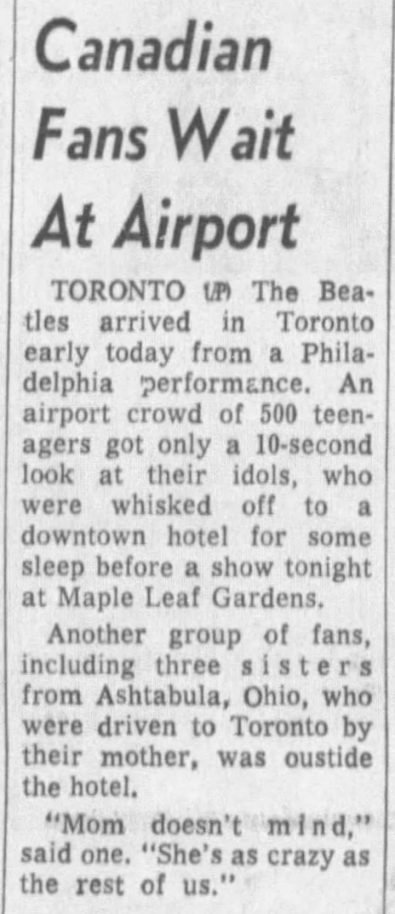 TORONTO. The Beatles arrived in Toronto early today from a Phila delphia performance. An airport crowd of 500 teenagers got only a 10-second look at their idols, who were whisked off to a downtown hotel for some sleep before a show tonight at Maple Leaf Gardens.