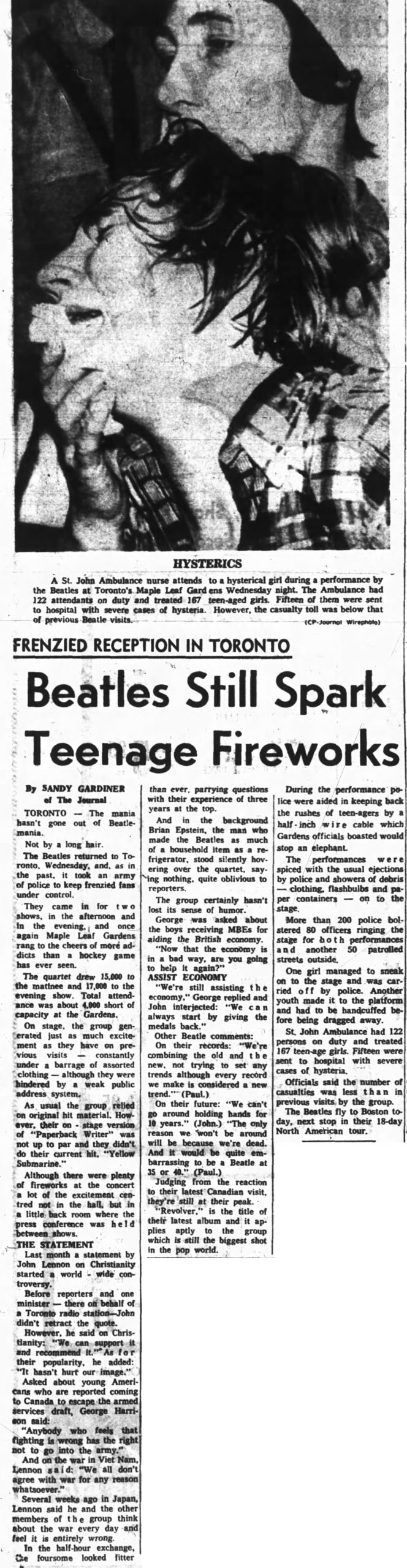 TORONTO — The mania hasn’t gone out of Beatlemania. Not by a long hair. The Beatles returned to Toronto, Wednesday, and, as in the past, it took an army of police to keep frenzied fans under control. They came in for two shows, in the afternoon and in the evening, and once again Maple Leaf Gardens rang to the cheers of more addicts than a hockey game has ever seen. The quartet drew 15,000 to the matinee and 17,000 to the evening show. Total attendance was about 4,000 short of capacity at the Gardens.