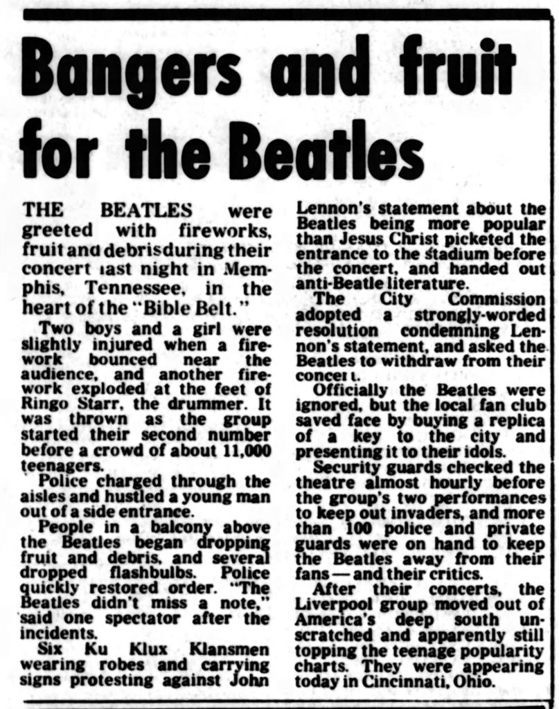 THE BEATLES were greeted with fireworks, fruit and debris during their concert last night in Memphis, Tennessee, in the heart of the “Bible Belt.”