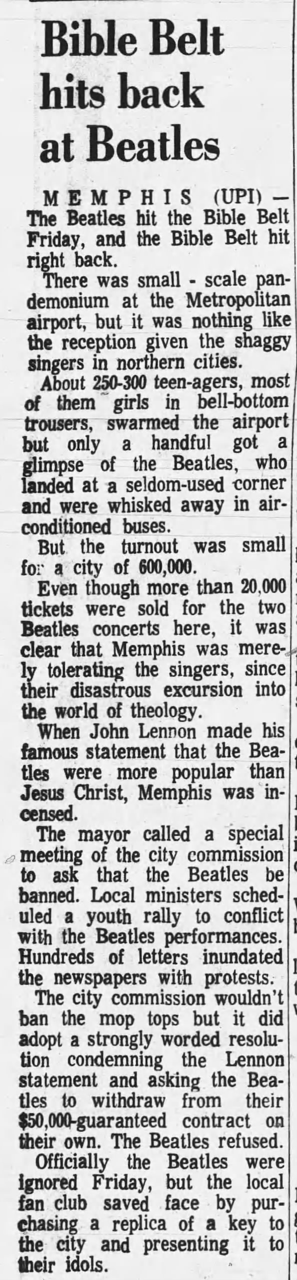 Even though more than 20,000 tickets were sold for the two Beatles concerts here, it was clear that Memphis was merely tolerating the singers, since their disastrous excursion into the world of theology.