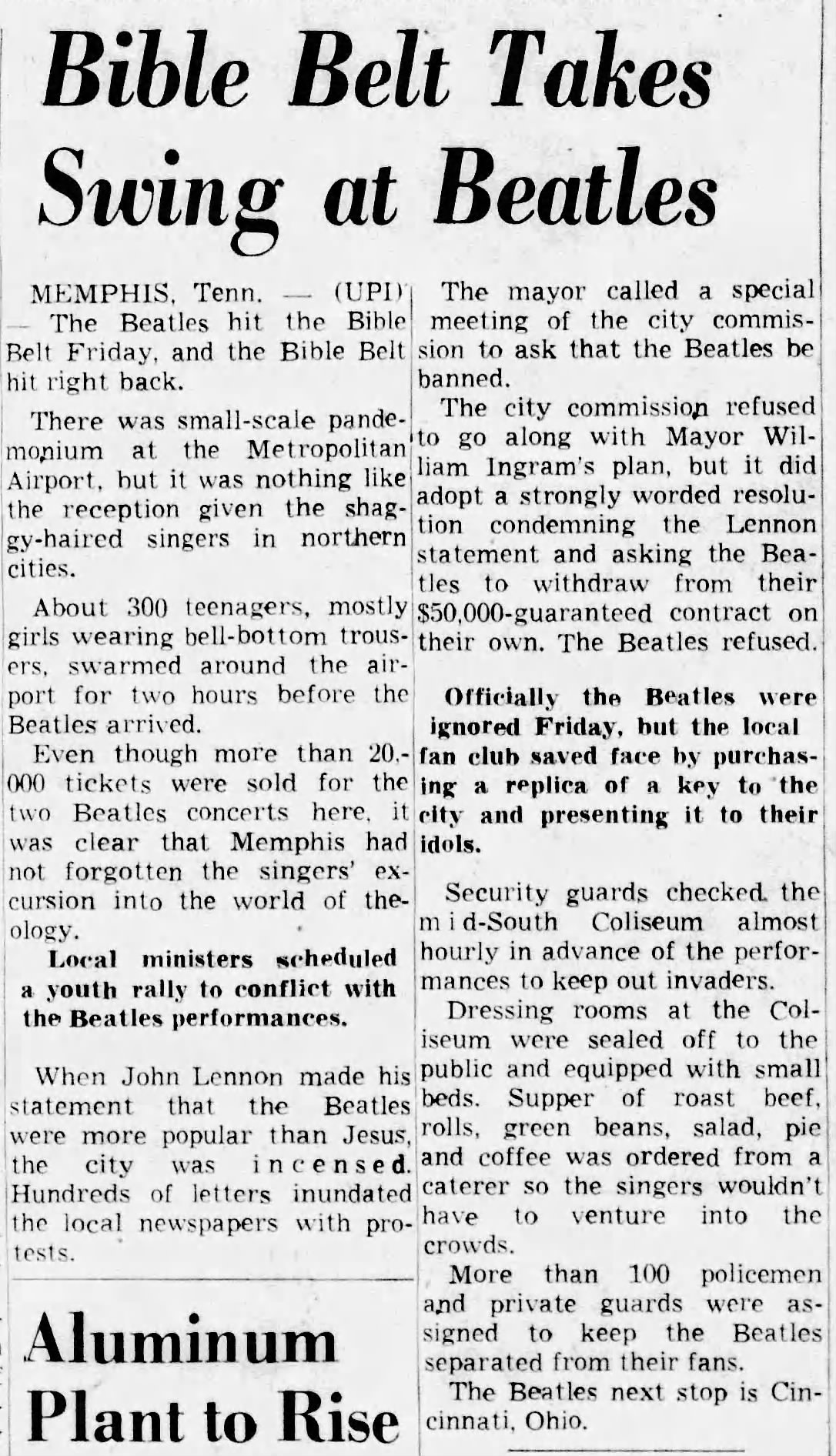 MEMPHIS, Tenn. — (UPI) The Beatles hit the Bible Belt Friday, and the Bible Belt hit right back. There was small-scale pandemonium at the Metropolitan’ Airport, but it was nothing like the reception given the shaggy-haired singers in northern cities. About 300 teenagers, mostly girls wearing bell-bottom trousers, swarmed around the airport for two hours before the Beatles arrived.