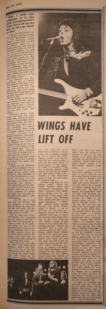 Wings’ triumph – and, after the years in the cold, a special triumph for Paul was no foregone conclusion. The audience offered a cool, though sympathetic, round of applause when the dapper five followed Brinsley Schwarz and a cheerful tap dancer onto the stage and, even after a rousing Big Barn Bed (from Red Rose Speedway) had set feet a-twitch, it was a sure thing that Oxford was not going to give its heart lightly. “It’s all those intellectuals,” said Denny Seiwell after the show.