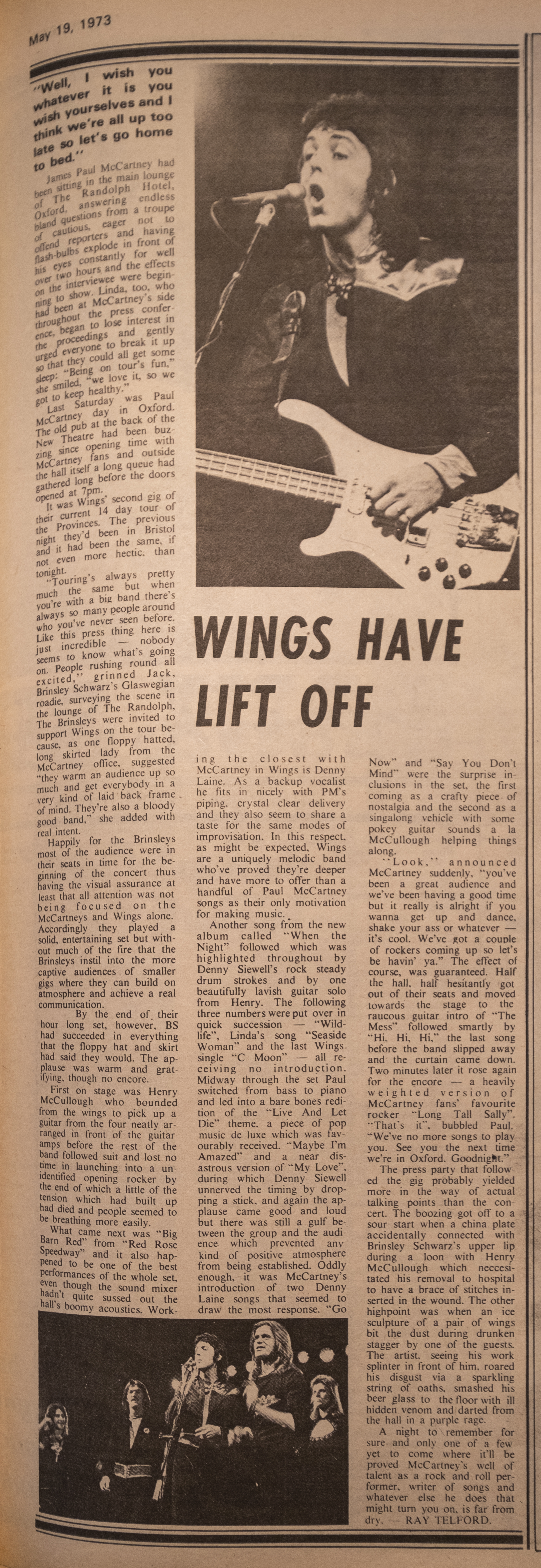 “Touring’s always pretty much the same but when you’re with a big band there’s always many people around who you’ve never seen before. Like this press thing here is just incredible – nobody seems to know what’s going on. People rushing round all excited,” grinned Jack Brinsley Schwarz’s Glaswegian roadie, surveying the scene in the lounge of The Randolph. The Brinsleys were invited to Wings on the tour because, as one floppy-hatted, long-skirted lady from the McCartney office suggested “they warm an audience up so much and get everybody in a very kind of laid back frame of mind. They’re also a bloody good band,” she added with real intent.