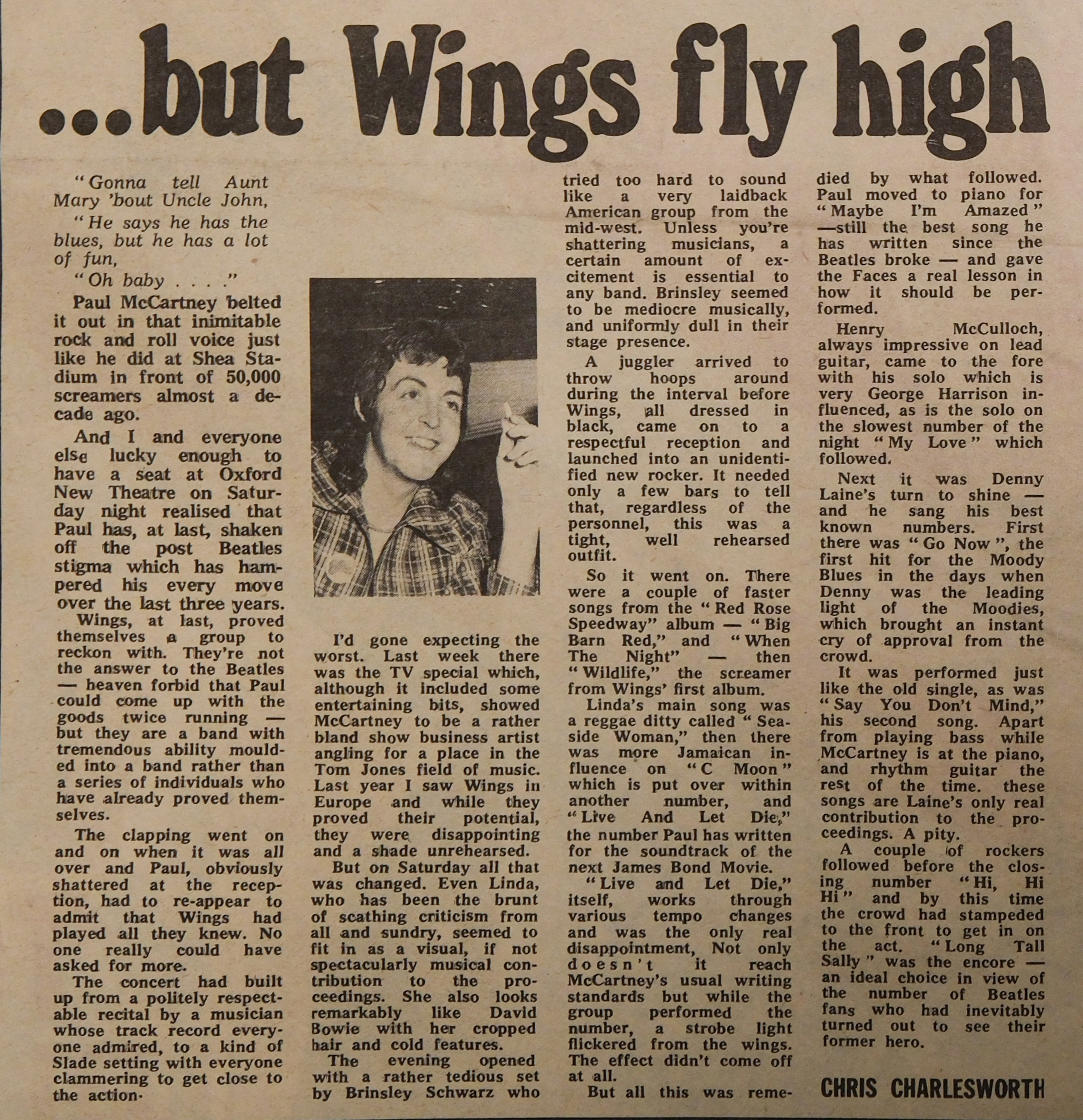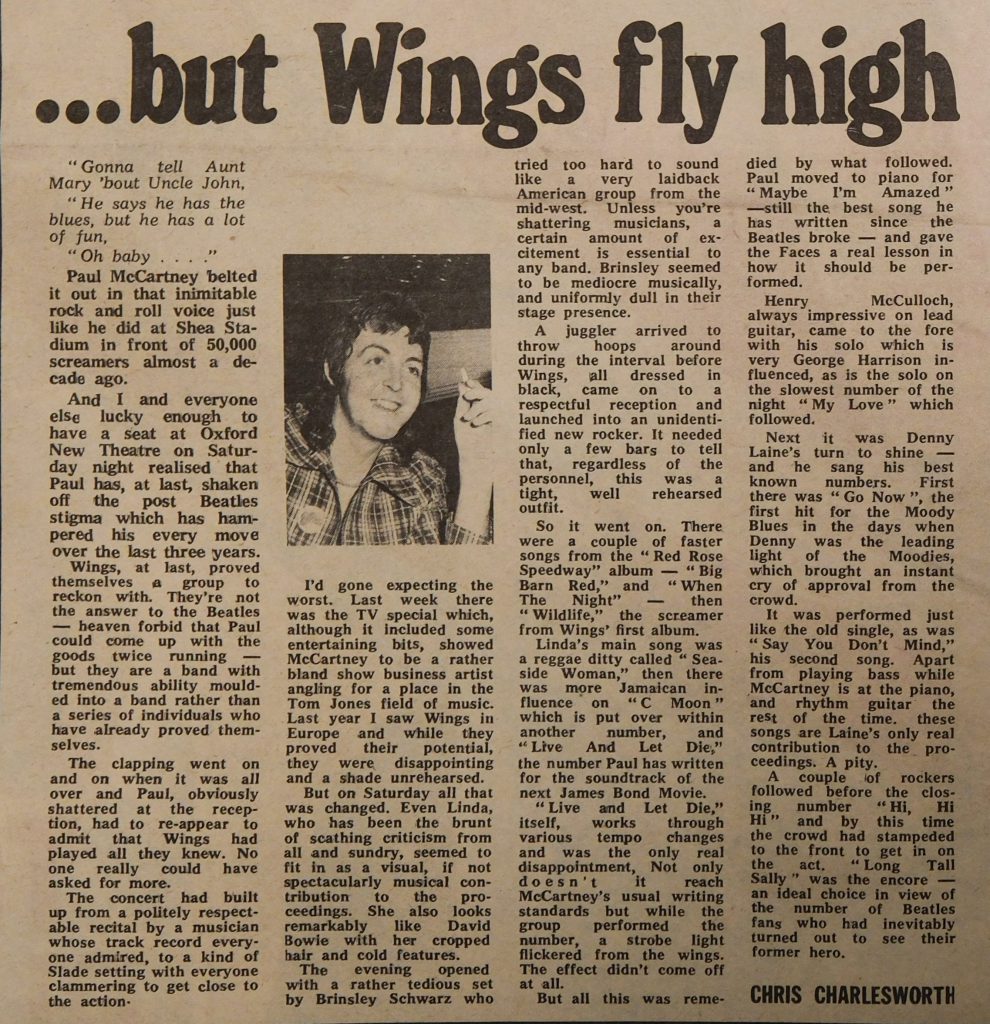 Wings’ triumph – and, after the years in the cold, a special triumph for Paul was no foregone conclusion. The audience offered a cool, though sympathetic, round of applause when the dapper five followed Brinsley Schwarz and a cheerful tap dancer onto the stage and, even after a rousing Big Barn Bed (from Red Rose Speedway) had set feet a-twitch, it was a sure thing that Oxford was not going to give its heart lightly. “It’s all those intellectuals,” said Denny Seiwell after the show.