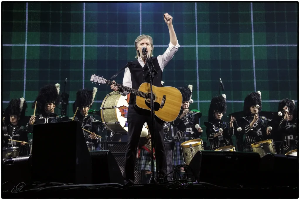 It was the encore, however, that would reveal the evening’s most special surprise: Following the roars of approval that greeted the Hamilton debut of Paul’s virtual duet with John on “I’ve Got a Feeling,” Paul swapped out the Les Paul for an acoustic guitar and for the first and only Got Back 2025 performance of “Mull of Kintyre,” accompanied by local Scottish-music troupe the Paris Port Dover Pipe Band, effectively “transforming a big-ticket rock concert into a community-centre gathering” to quote the TORONTO STAR.