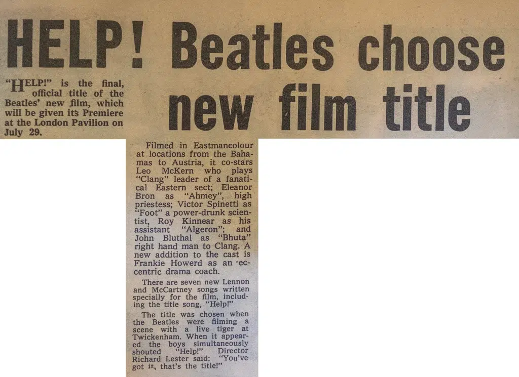 John: “Help! was too Disneyland. Later there was a rash of films similar to Help! and I could see what Richard Lester, the director, was doing. But he didn’t really utilise us in that film. He forgot about who and what we were, and that’s why the film didn’t work. It was like having clowns in a movie about frogs.”