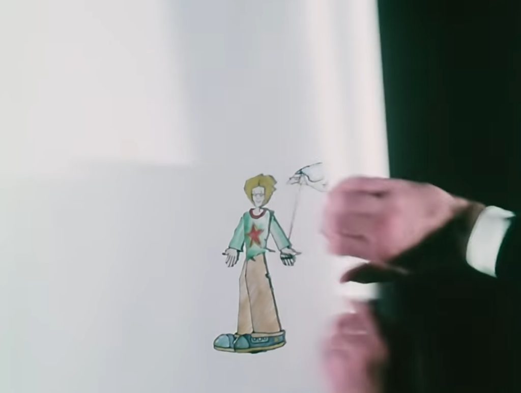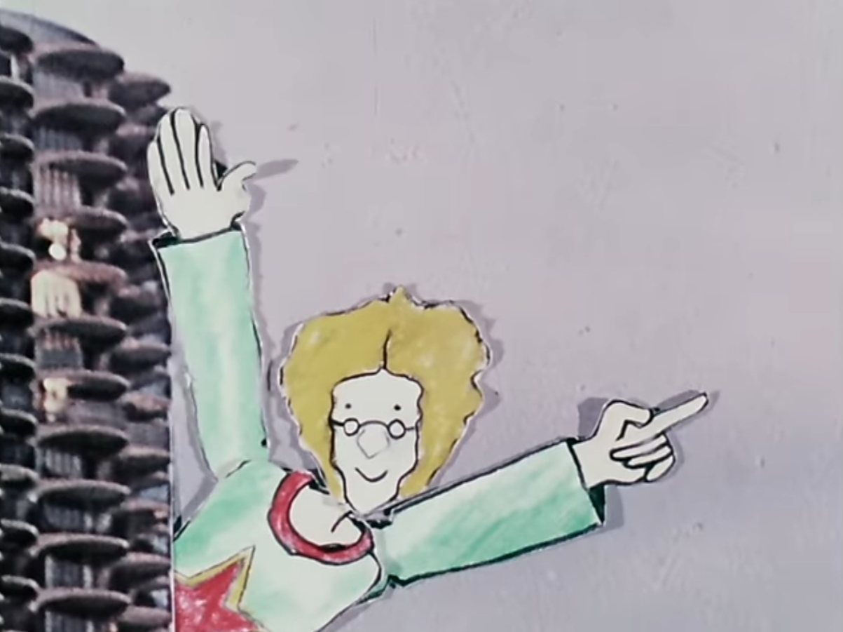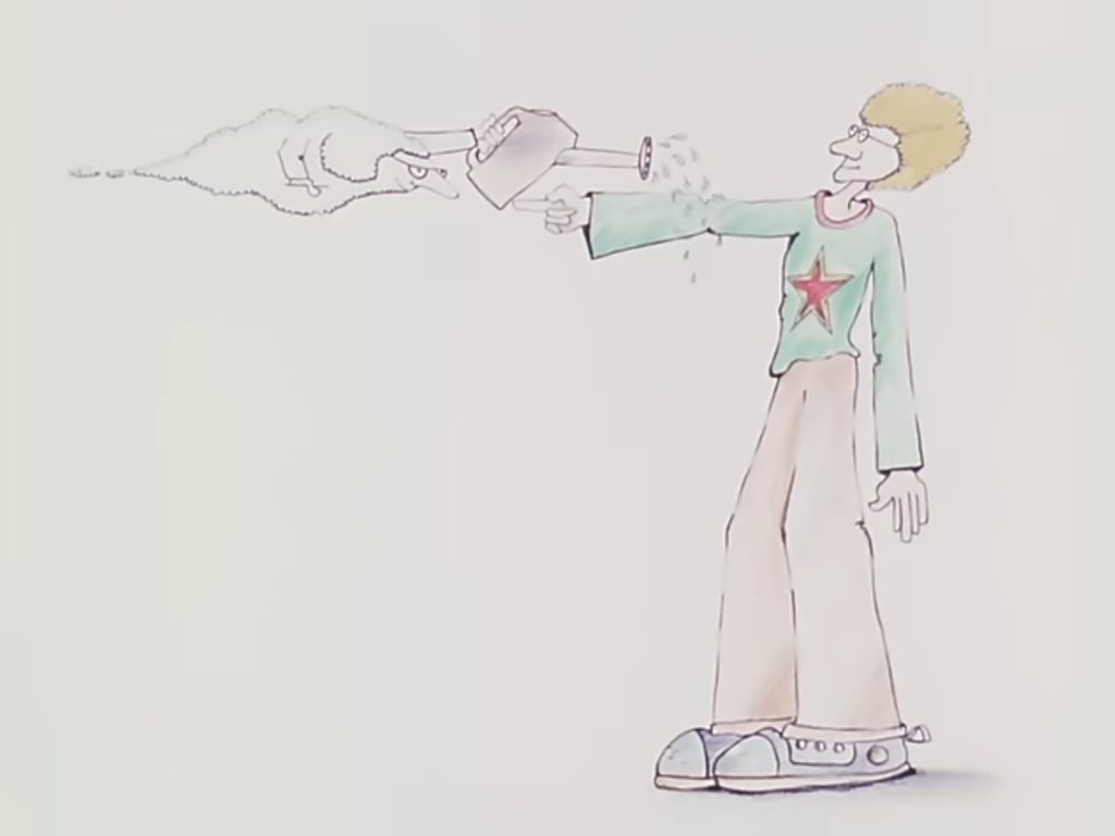 The animation is fun, being reminiscent (overseas readers will have to bear with us while we British indulge in a spot of TV nostalgia here) of Ivor the Engine, Noggin the Nog and Captain Pugwash. That is, instead of animating a series of drawings, Jim Quick has made the two main characters — a perm-haired youth in granny glasses, star-shirt and loon pants, and a watering can with a face — into cardboard cut-outs that he has painstakingly moved from position to position before filming frame by frame. Begging your pardon for the coming pun, but it can’t have been a quick process. But then, that’s the animating business for you.