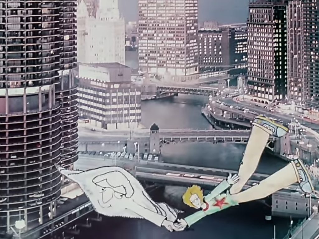 The words-to-picture scenario was carried out quite literally, so a photo of Los Angeles appears when the lyric mentions “LA rainclouds”, a seed is watered and bursts into a large yellow sunflower for the line “A seed is waiting in the earth for rain to come and give it birth” and, when the song reaches the line “Strip off your plastic mac”, the animator’s hand comes suddenly into vision to pull off the animated character’s yellow rainwear. (Inessential trivia note: the word “mac” also appeared in two Lennon-McCartney songs: ‘Penny Lane’ and ‘The Ballad Of John And Yoko’. Could this third occurrence construe another of the tortuous Paul Is Dead clues? Read all about it – “Mac Sings About A Mac For Third Time – A Pagan Sign Of Death In Iwo Jima”…)