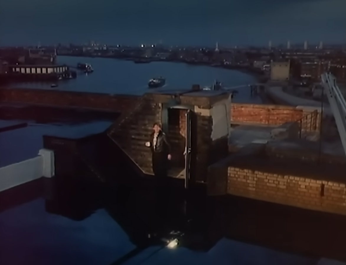 First we go to Bermondsey, Tommy Steele’s home patch in London’s dockland, for the ballad video. One Paul McCartney, a projectionist in ‘municipal’ brown coat, picks up a whistling kettle and fills his mug as the number he’s just dialled rings unanswered – not for the first time, you suspect. Completing the cheery scene, a mouse nibbles at his leftovers and is chased by the cinema cat. The poor fellow switches his coat for a leather jacket, revealing an exotic print shirt as worn by that chap in Broad Street, and takes his mug upstairs to the roof, whistling a rather good tune.