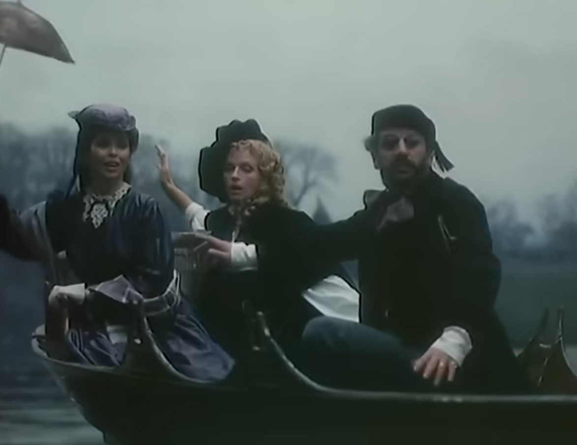 Once on the roof, the tune becomes a fully-fledged song and our lonely friend a jolly good singer. Old Father Thames and the lights of Tower Bridge make a poignant backdrop to his emotions when suddenly we’re whisked to a very different river. Some Victorians named Linda, Ringo and Barbara are boating peacefully when – what’s this? – they’re swept towards a weir and plunge over.