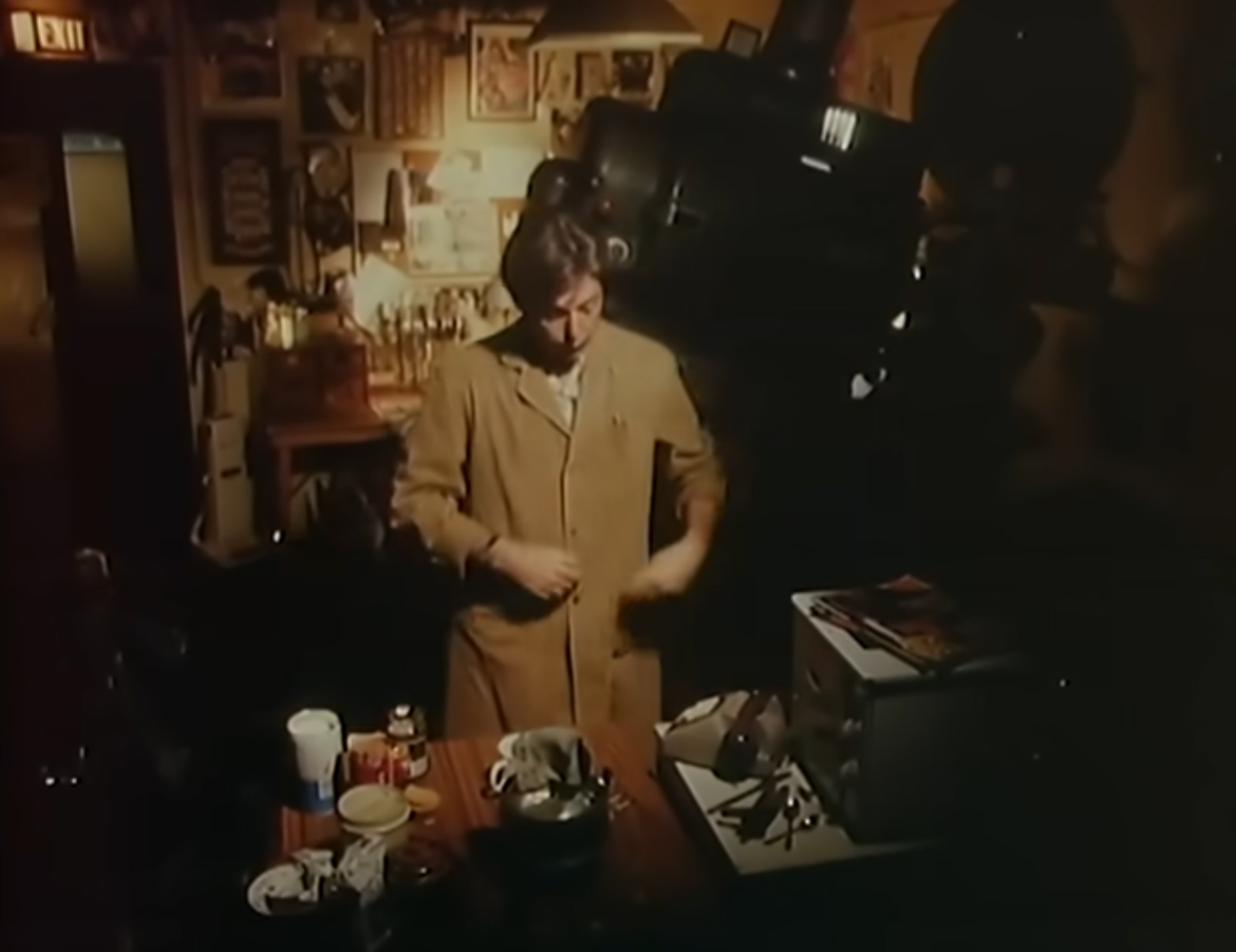 Back to our projectionist, as chrysanthemum starshell fireworks form shooting stars in the sky behind him. Now he’s driving along the river, walking past painted tarts, running up the stairs of the Old Justice pub, knocking on a door. A futuristic band materialize on stage in black-and-white feline make-up. Back on the cinema roof, ‘Broad Street’ lights up in blue neon. Paul peers through a skylight onto ‘Ballroom Dancing’ and a deuce of a fight.