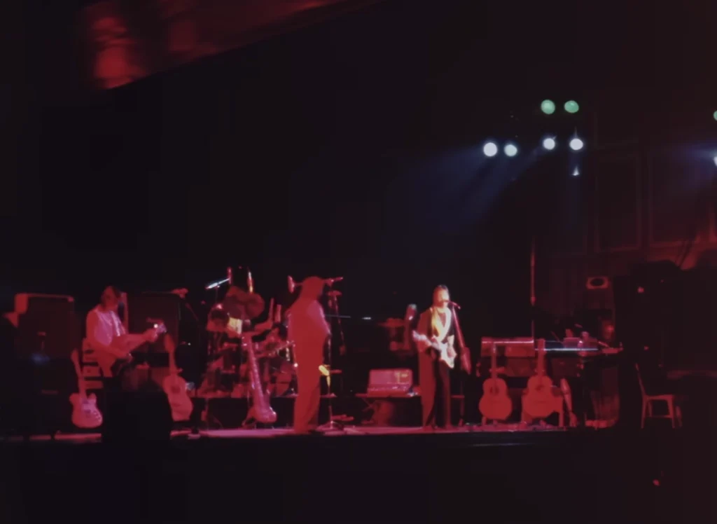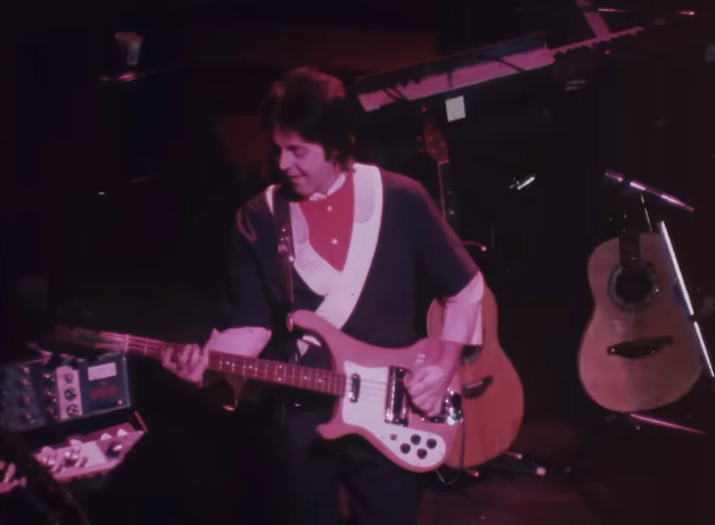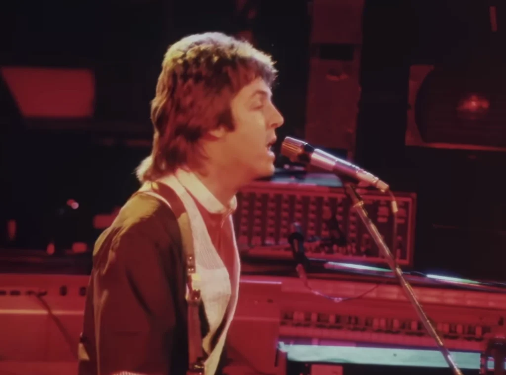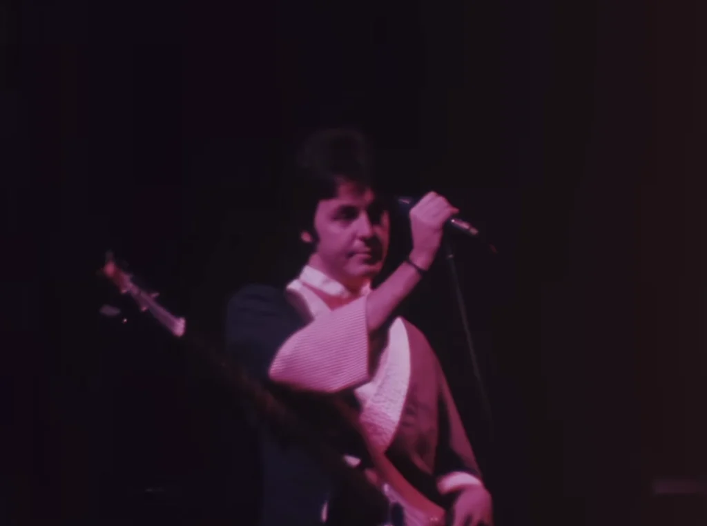 Audio from: Newcastle, Sept 16, 1975.Previously available information indicated that it was filmed at the Glasgow concert on September 21, 1975 which is incorrect. It’s an excellent edit of three different concerts without anyone noticing the differences at first glance. Wings came out dressed in the same clothes in Liverpool and Newcastle as the concerts would be professionally filmed and editing would be easier. 55% of the video is from Newcastle (front and right side shots with a camera set at a very high level, Linda and Denny’s keyboards on Paul’s left are in a different position; microphones and stands are almost attached to the edge of the stage); 40% of the scenes are from Liverpool (right side shots with a stage level camera, Linda and Denny’s keyboards are perfectly positioned to Paul’s left profile, the edge of the stage is far away from the microphones and masts); and 5% is from Glasgow (only six seconds shown towards the middle in shots with a camera on the left side of the stage, Denny and Jimmy can be seen in different clothes than the rest of the video).