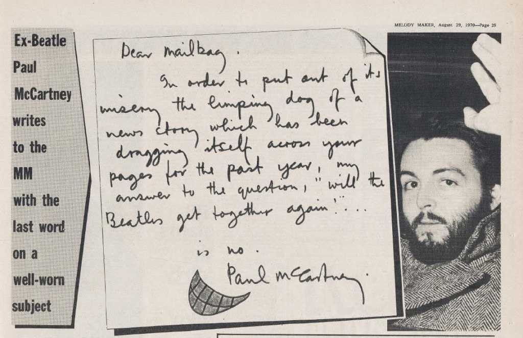 Two days later, in the August 29, 1970 edition of Melody Maker, a letter from Paul appeared in the “Mailbag” section. In it, he reiterated his position that The Beatles were finished, leaving no doubt that the split was final.